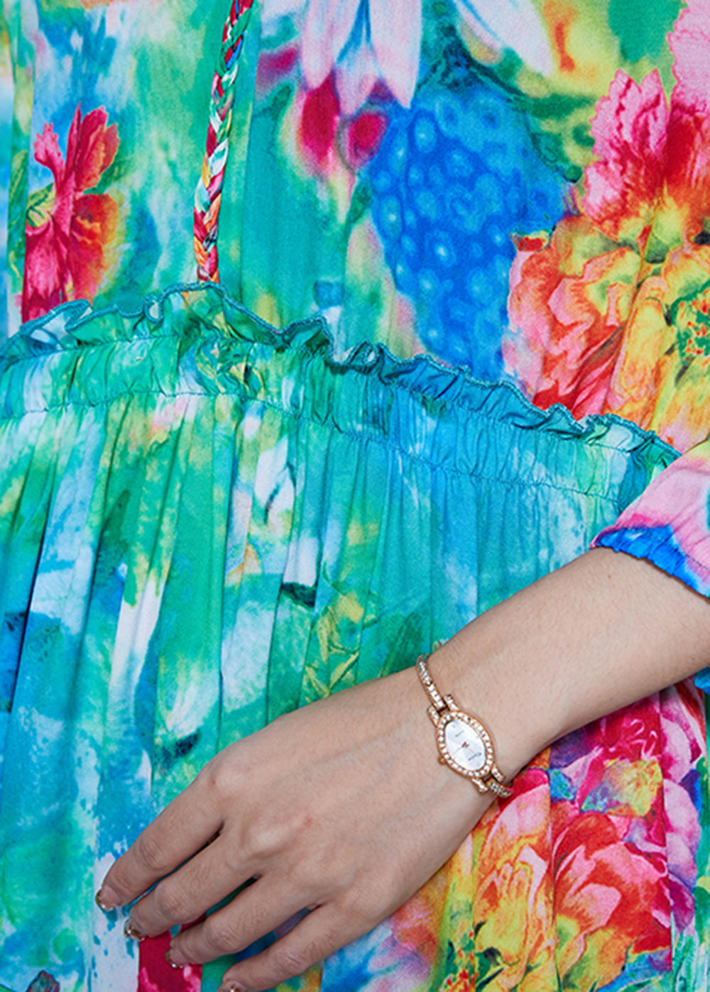 French Green Ruffled Print Exra Large Hem Silk Beach Dress Spring