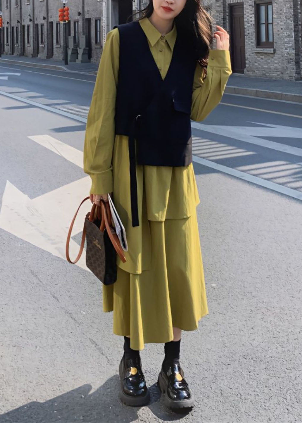 French Patchwork Black Waistcoat And Green Long Dress Two Pieces Set Long Sleeve