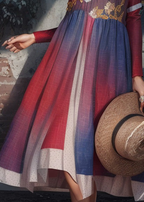 French Red O Neck Print Patchwork Cotton Maxi Dresses Long Sleeve