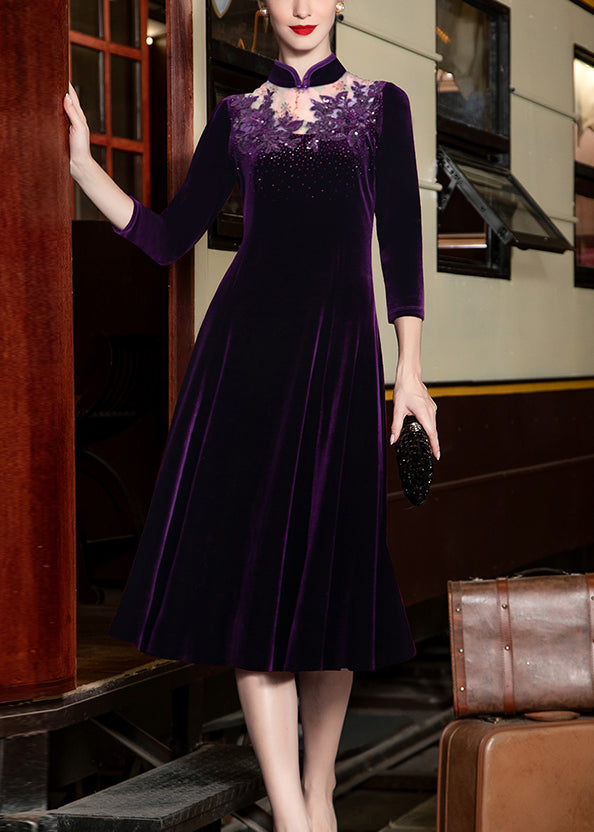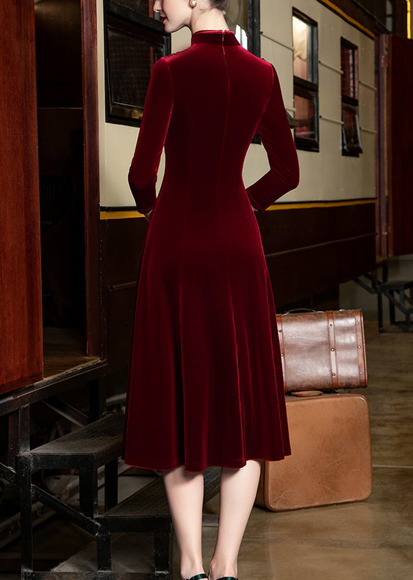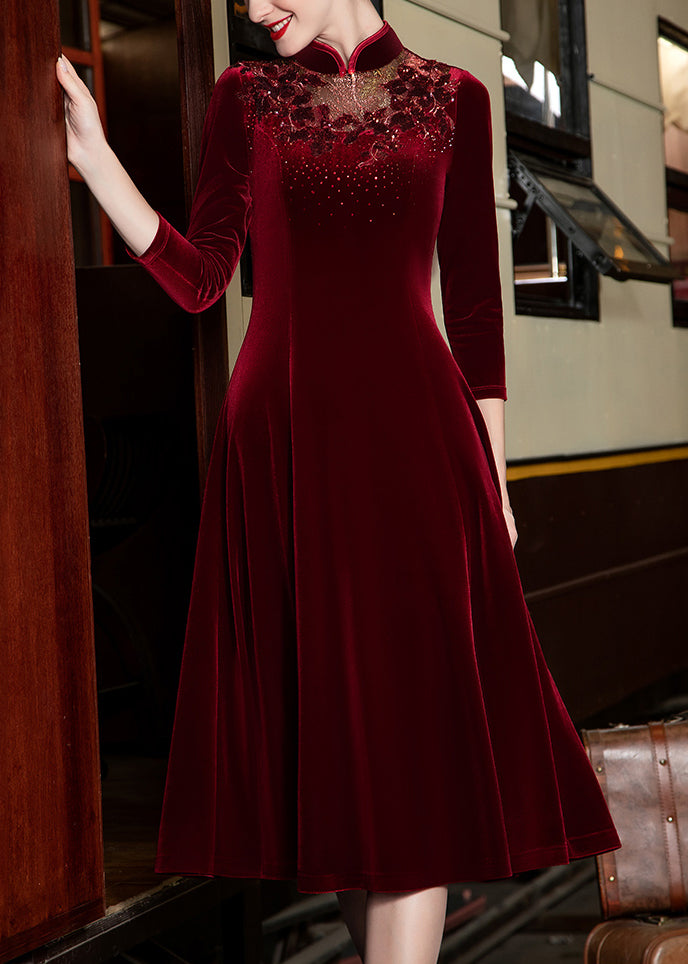 French Red Stand Collar Nail Bead Cotton Long Dresses Bracelet Sleeve