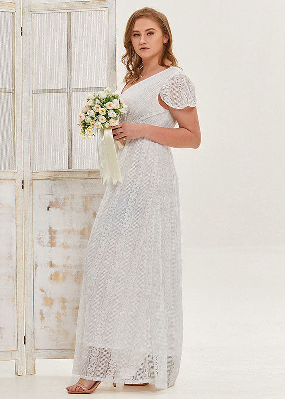Handmade White V Neck Wrinkled Patchwork Maxi Dresses Summer
