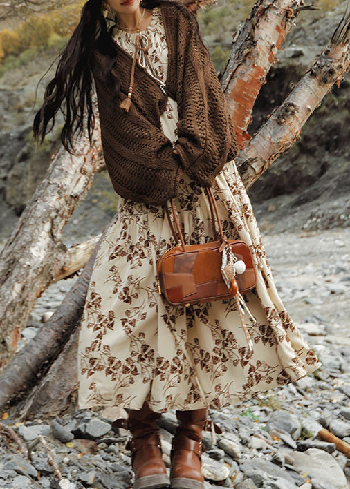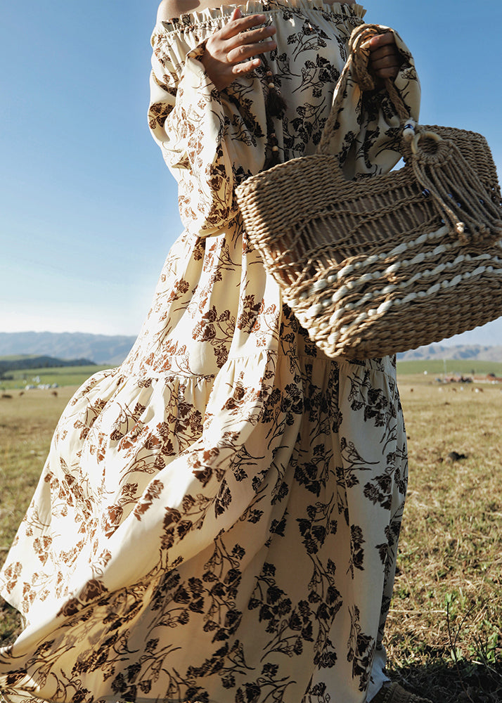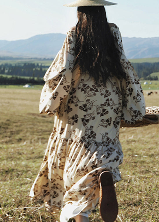 Holiday Style Slash Neck Print Cotton Dress Lantern Sleeve