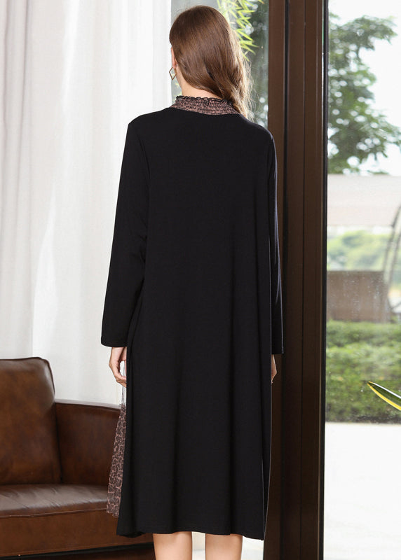 Italian Black Stand Collar Patchwork Leopard Cotton Fake Two Piece Dresses Spring