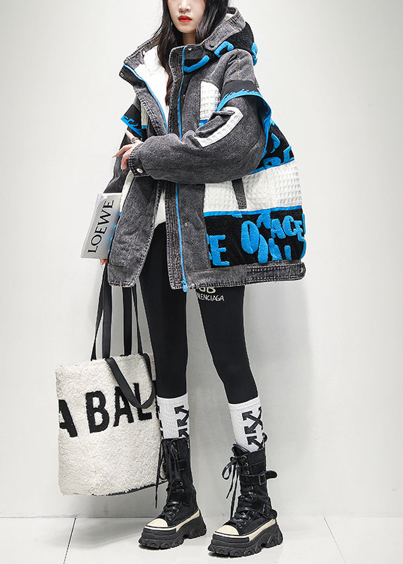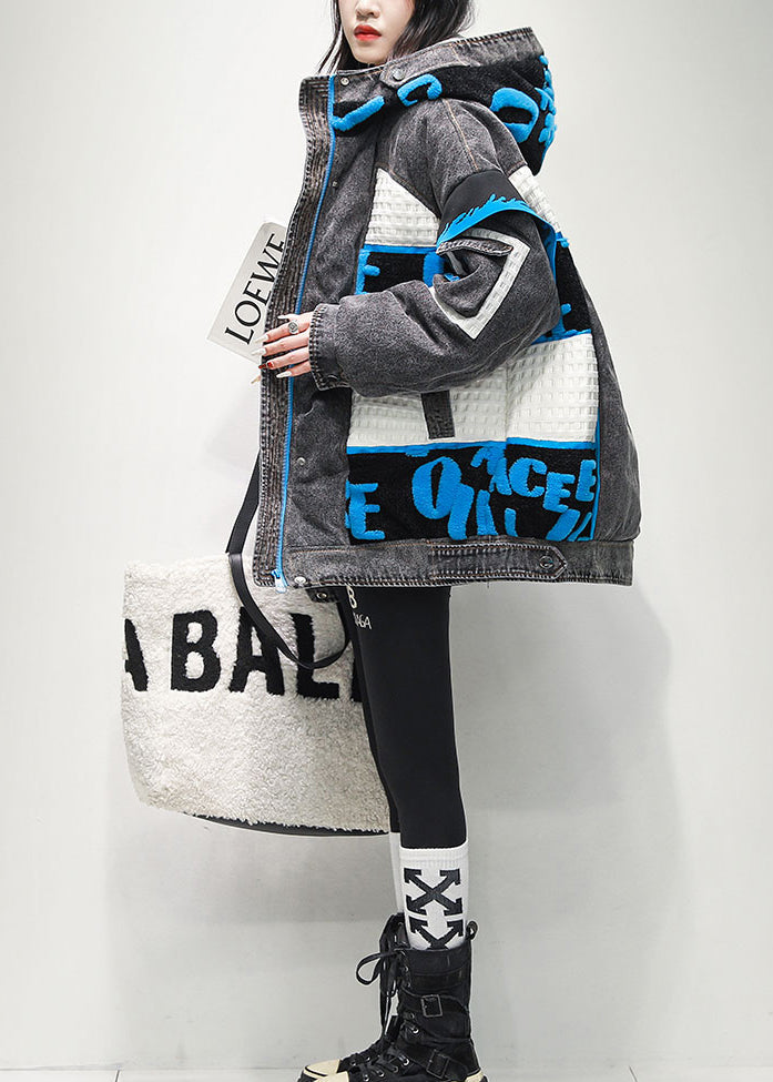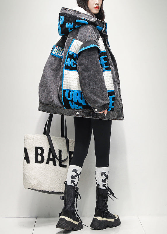 Italian Black Zip Up Denim Patchwork Duck Down Down Hooded Jacket Winter