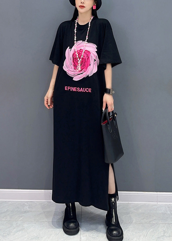Loose Black O Neck Print Side Open Cotton T Shirt Dresses Summer