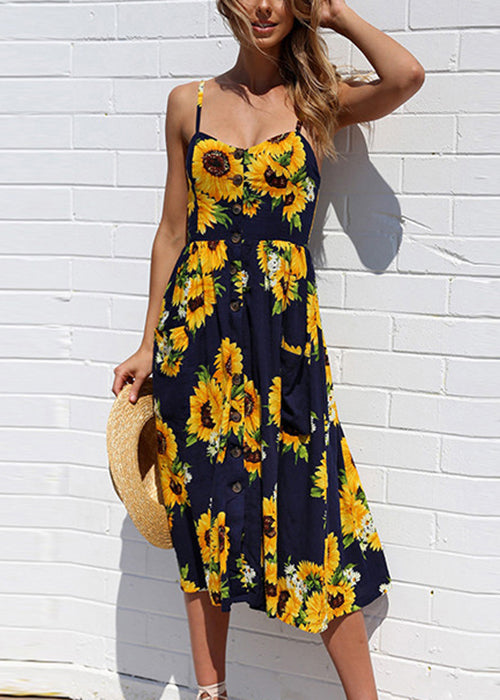 Loose Black Print Button High Waist Cotton Dresses Sleeveless