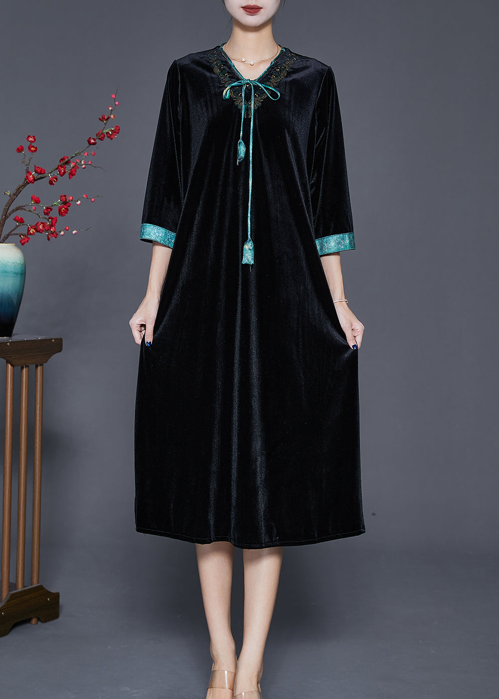 Modern Black V Neck Neck Tie Silk Velour Dress Half Sleeve
