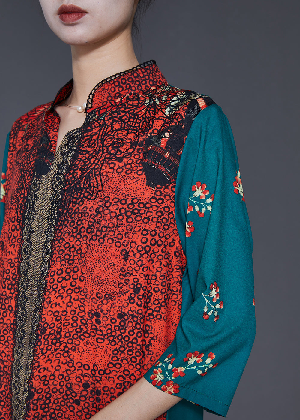 Modern Colorblock Stand Collar Print Silk Dresses Bracelet Sleeve