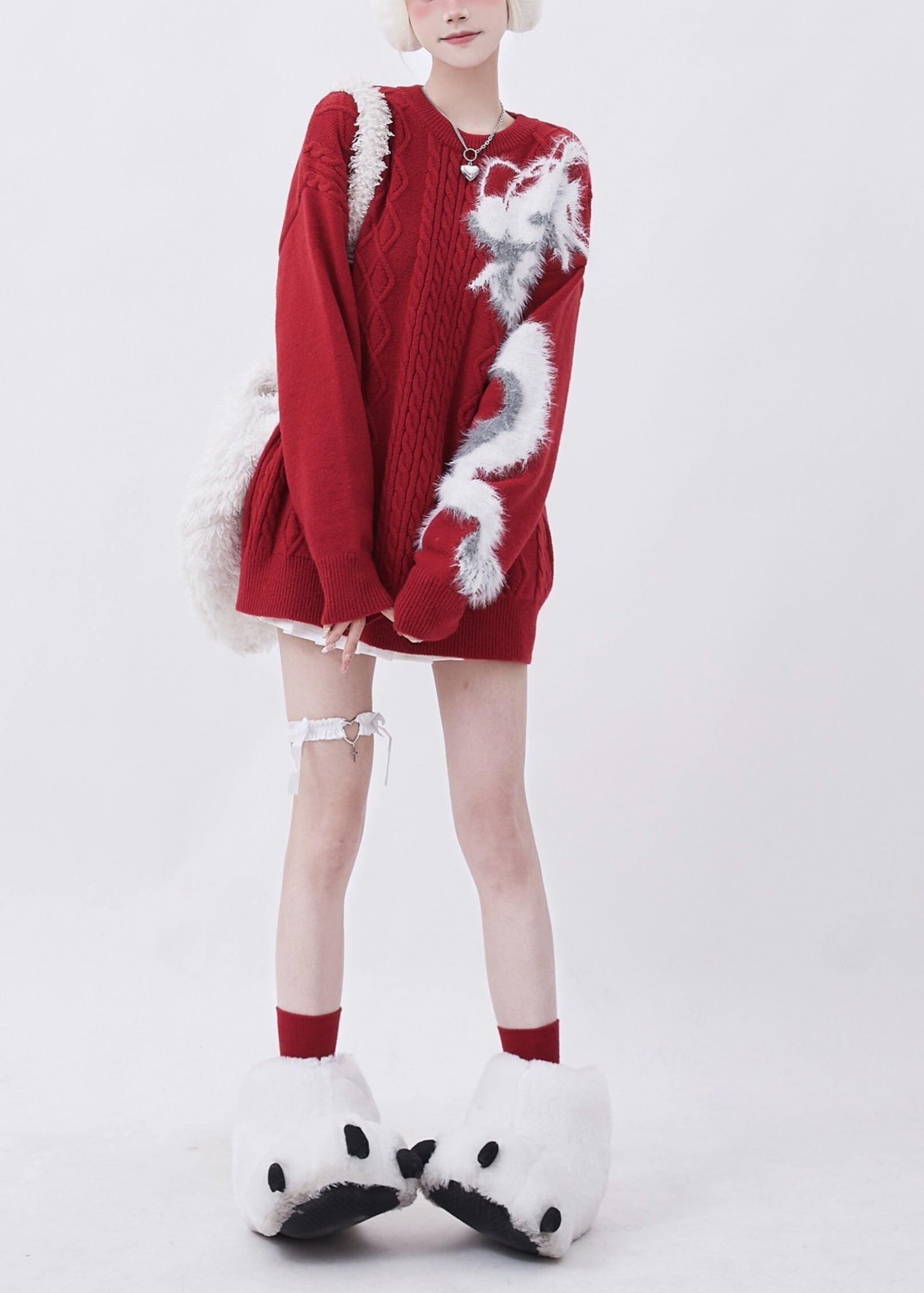 Natural Red Oversized Warm Knit Short Sweater Spring