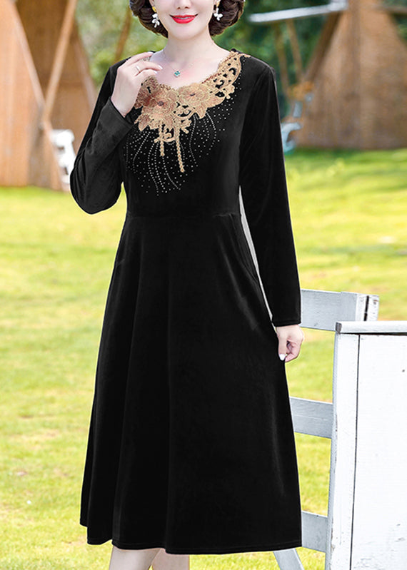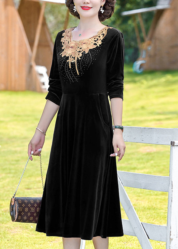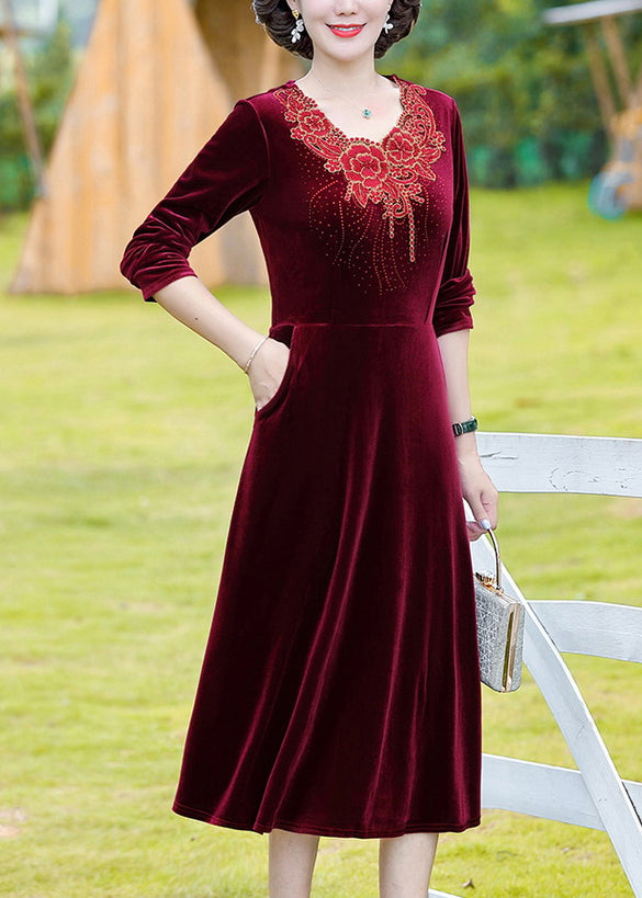 Natural Wine Red O-Neck Floral Patchwork Silk Velour Long Dress Fall