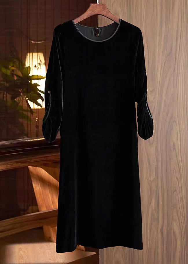 New Khaki O Neck Patchwork Silk Velour Dress Lantern Sleeve