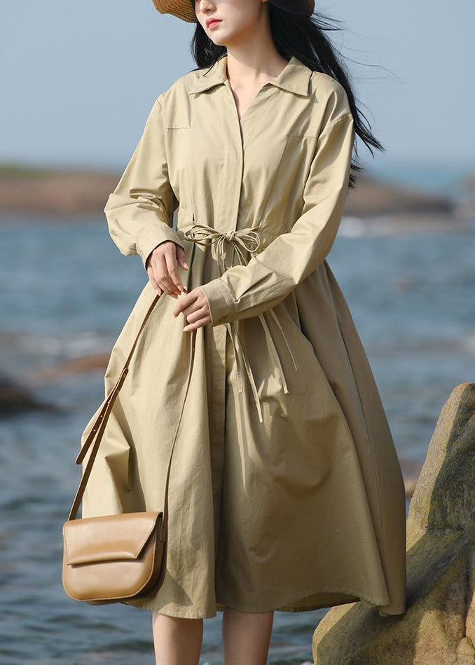 New Khaki Peter Pan Collar Lace Up Cotton Blouse Dress Fall