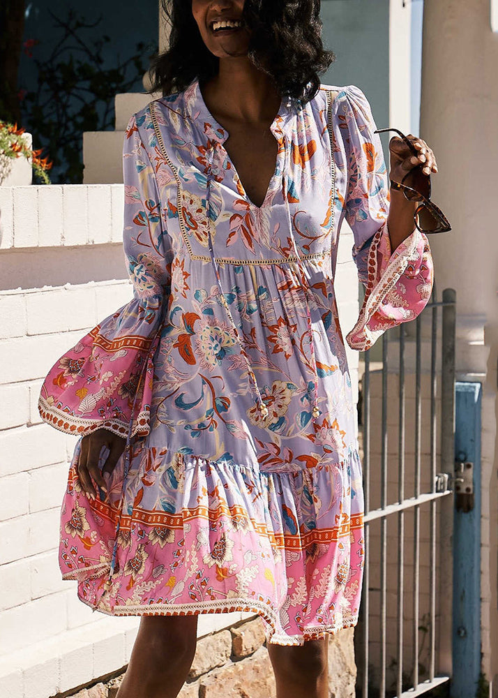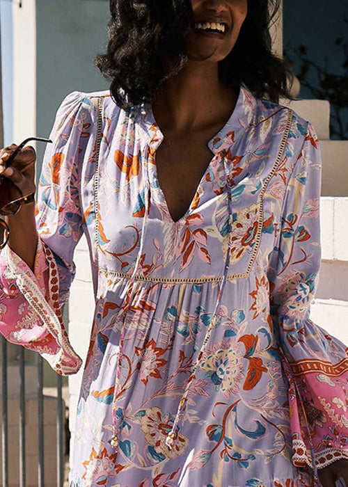 New Purple V Neck Lace Up Print Cotton Mid Dress Spring