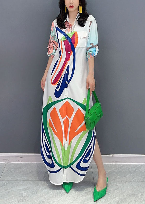 Organic White Peter Pan Collar Print Patchwork Cotton Maxi Shirts Dress Summer