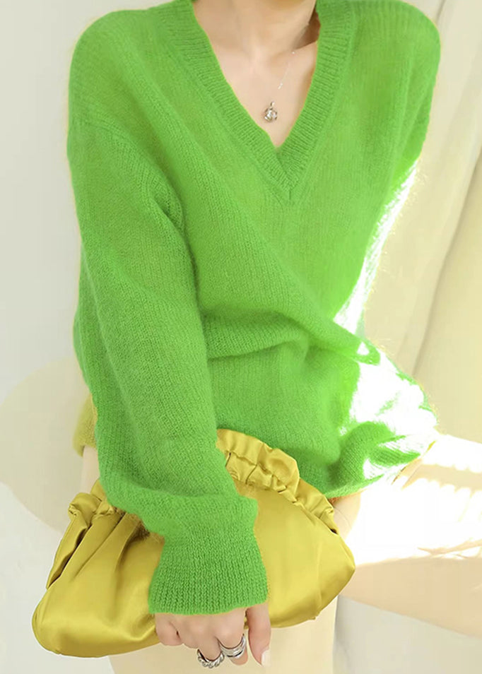 Oversized Simple Green V Neck Cozy Knit Sweaters Fall
