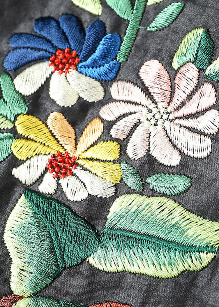 Plus Size Black Embroideried Floral Button Silk Velour Parka Winter