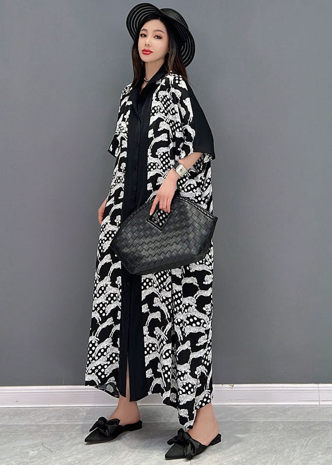 Plus Size Black Peter Pan Collar Print Button Cotton Shirt Dress Short Sleeve