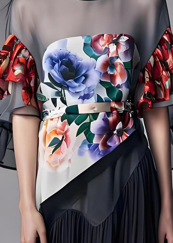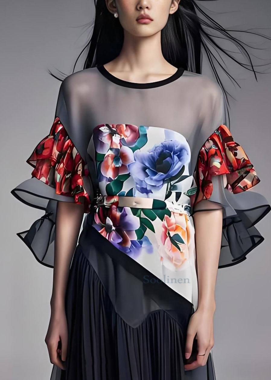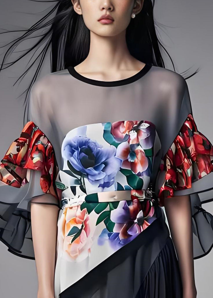 Plus Size Grey O-Neck Print Organza Patchwork Chiffon Dresses Butterfly Sleeve