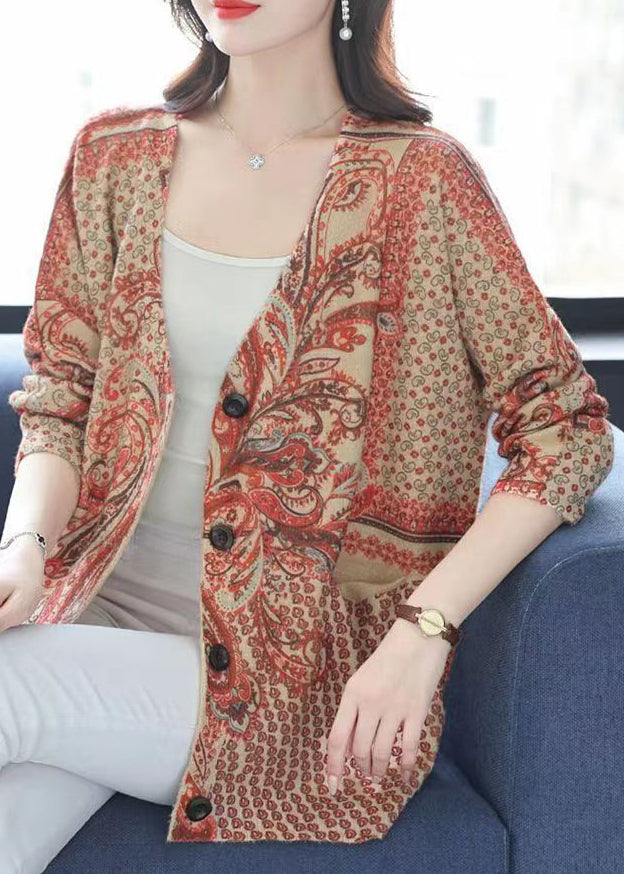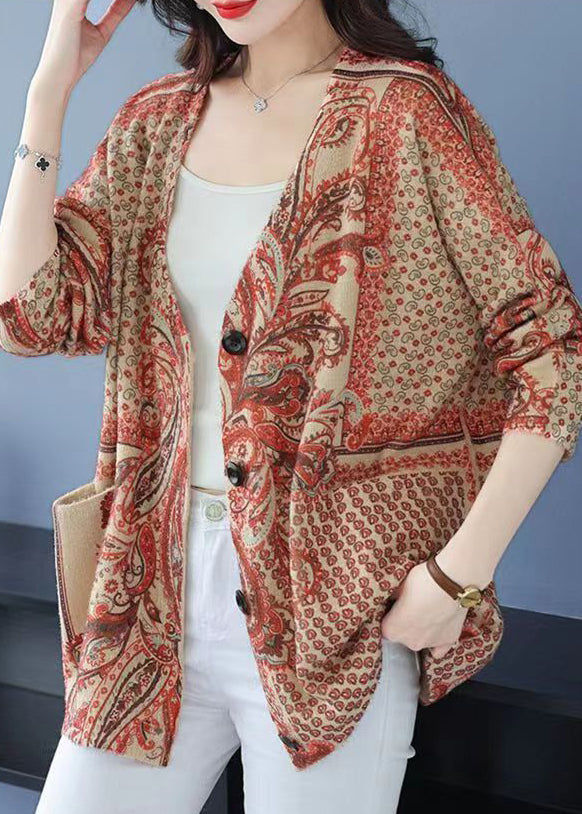 Plus Size Orange V Neck Print Button Mink Hair Knitted Coat Fall
