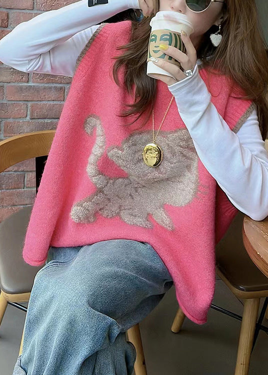 Plus Size Watermelon Red O Neck Cozy Knit Waistcoat Sleeveless