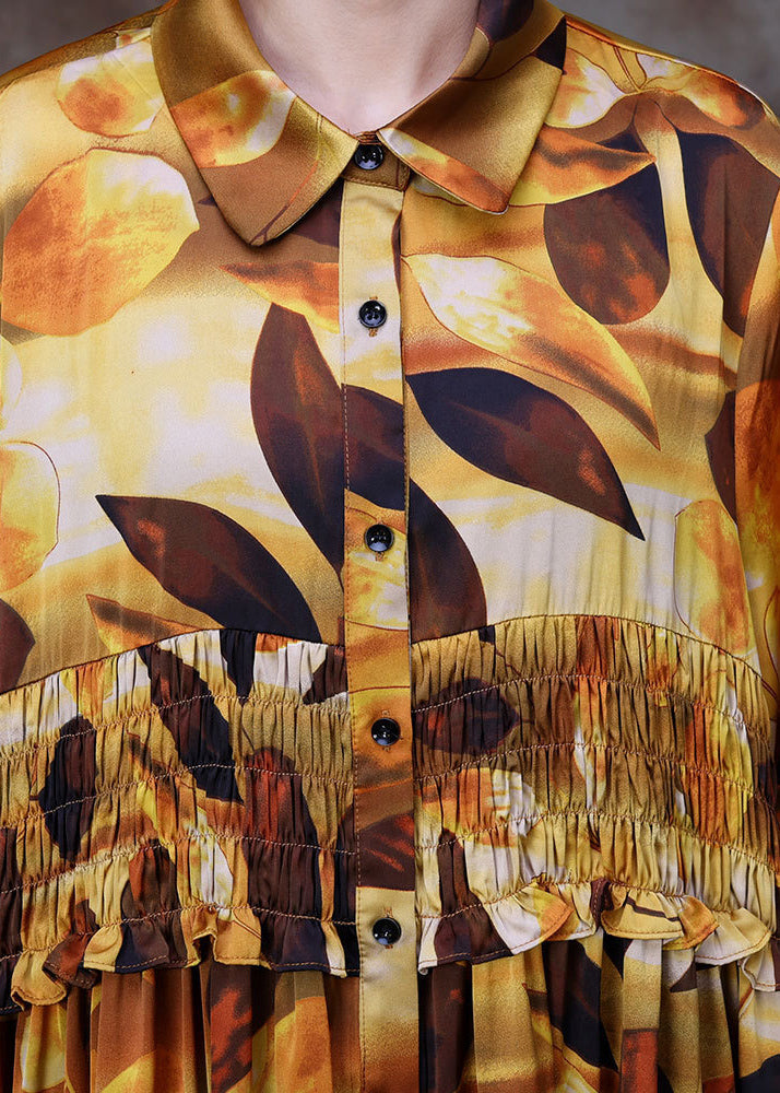 Plus Size Yellow Peter Pan Collar Print Wrinkled Silk Long Shirt Dress Half Sleeve