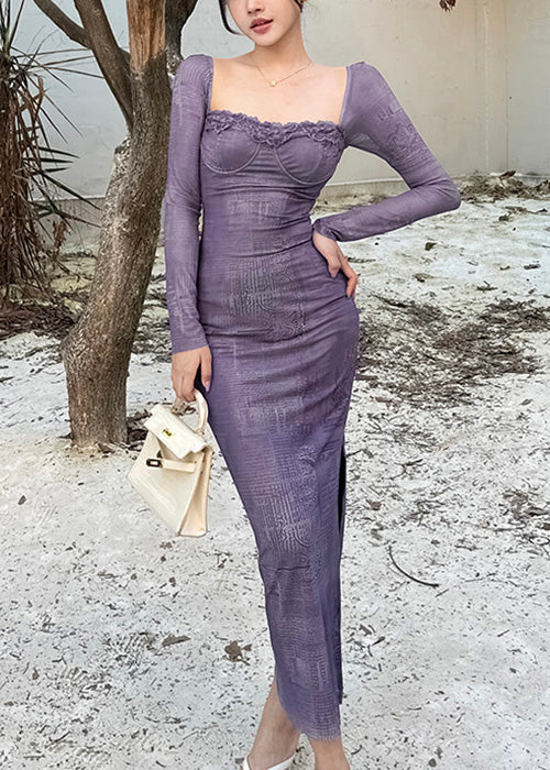 Sexy Pink Square Collar Side Open Cotton Long Dress Spring
