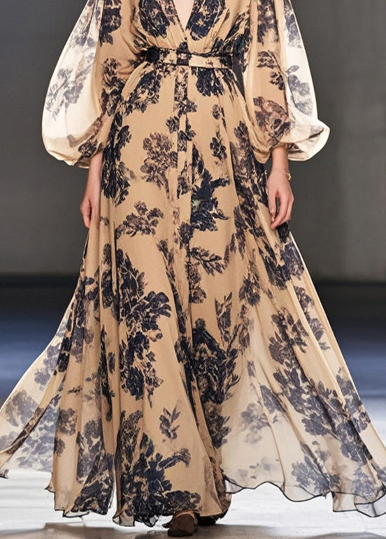 Simple Coffee Cinched Print Chiffon Ankle Dress Spring
