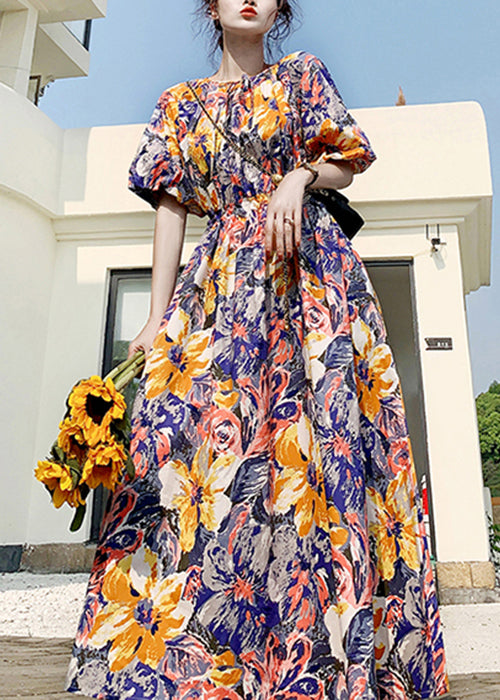 Stylish Blue O Neck Print Lace Up Patchwork Cotton Dress Summer