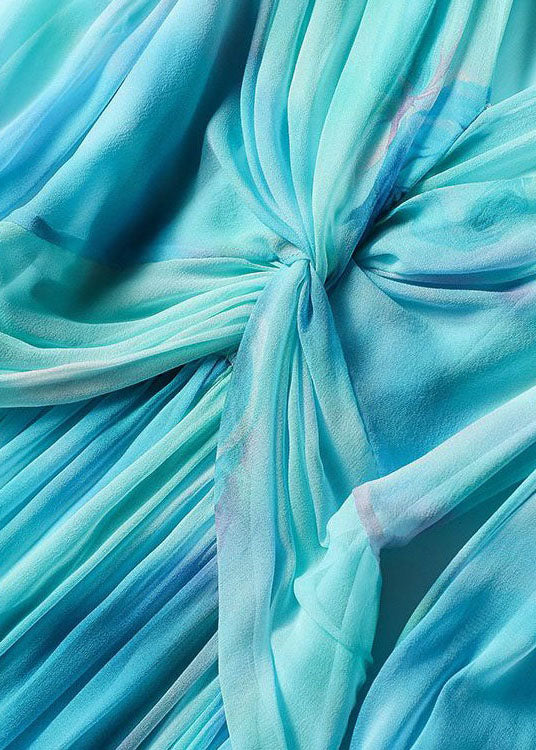 Stylish Blue V Neck Print Patchwork Exra Large Hem Silk Dress Spring