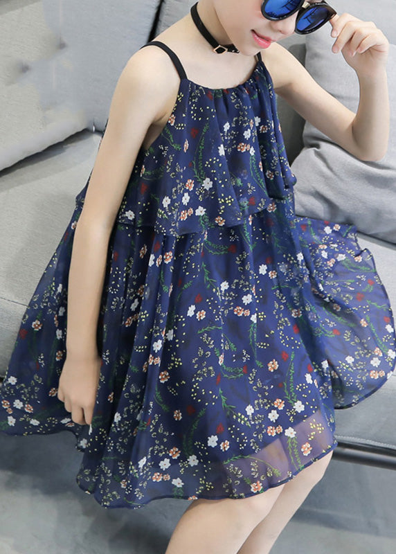 Unique Blue Print Wrinkled Girls Chiffon Slip Mid Sundress Sleeveless
