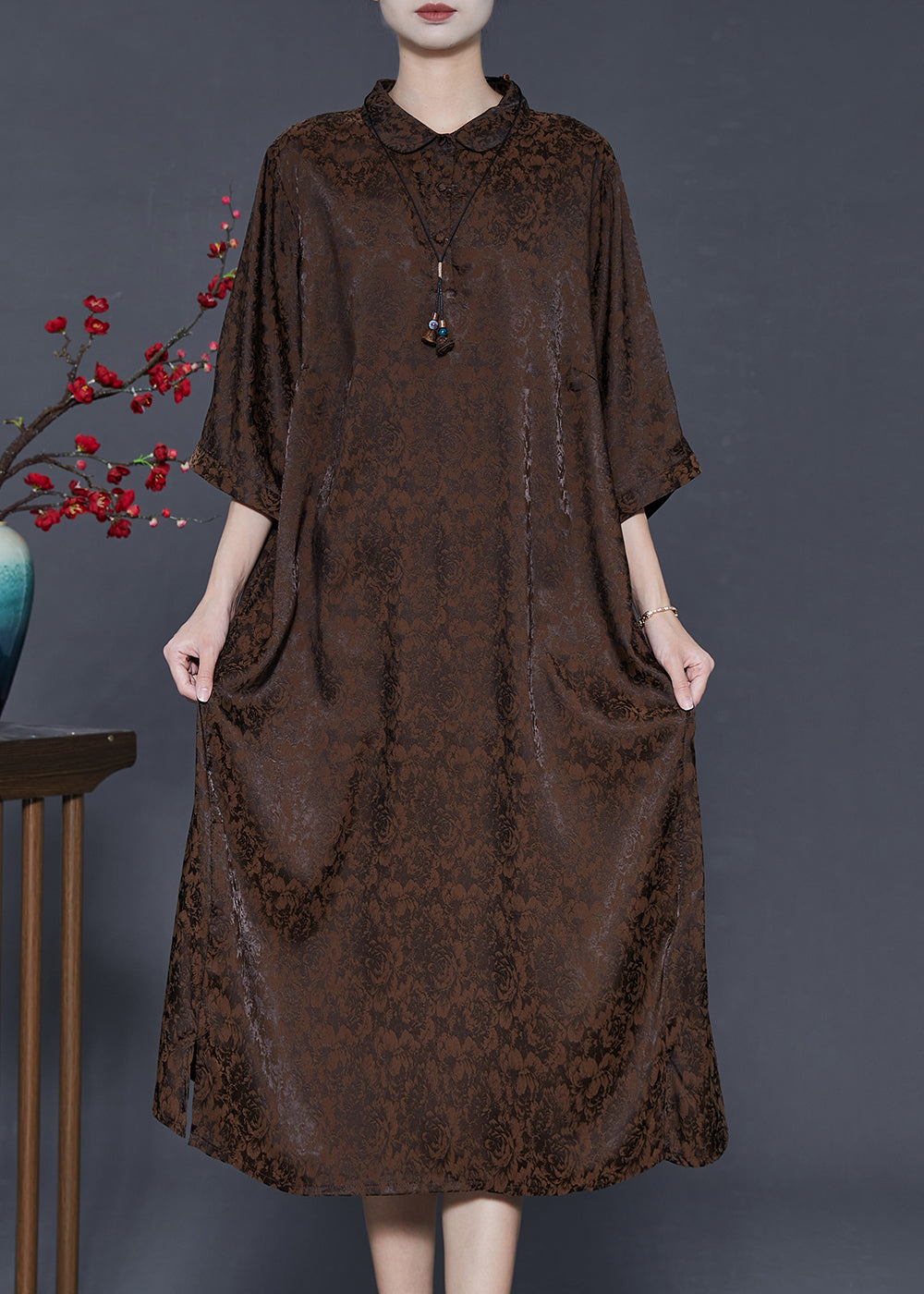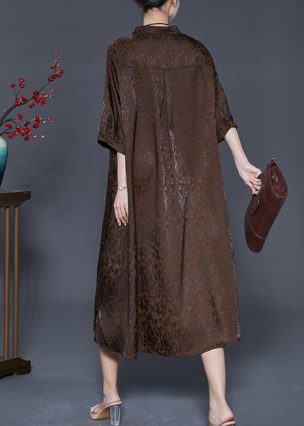 Vintage Chocolate Jacquard Silk Maxi Dresses Bracelet Sleeve