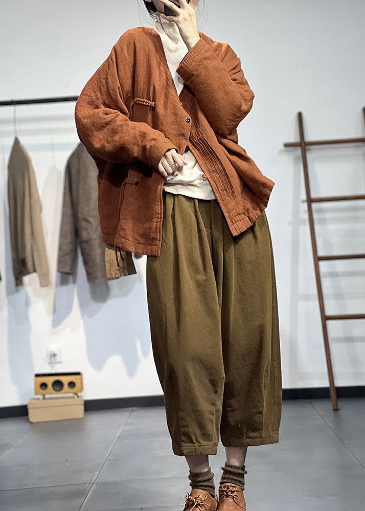 Vintage Orange V Neck Solid Wrinkled Fine Cotton Filled Winter Coats