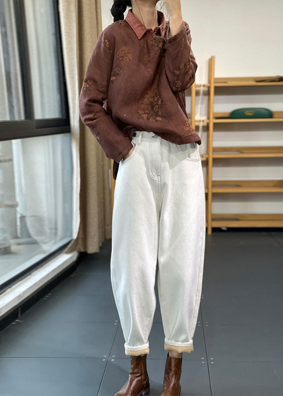 Vintage Red Peter Pan Collar Print Cotton Filled Linen Shirt Tops Winter