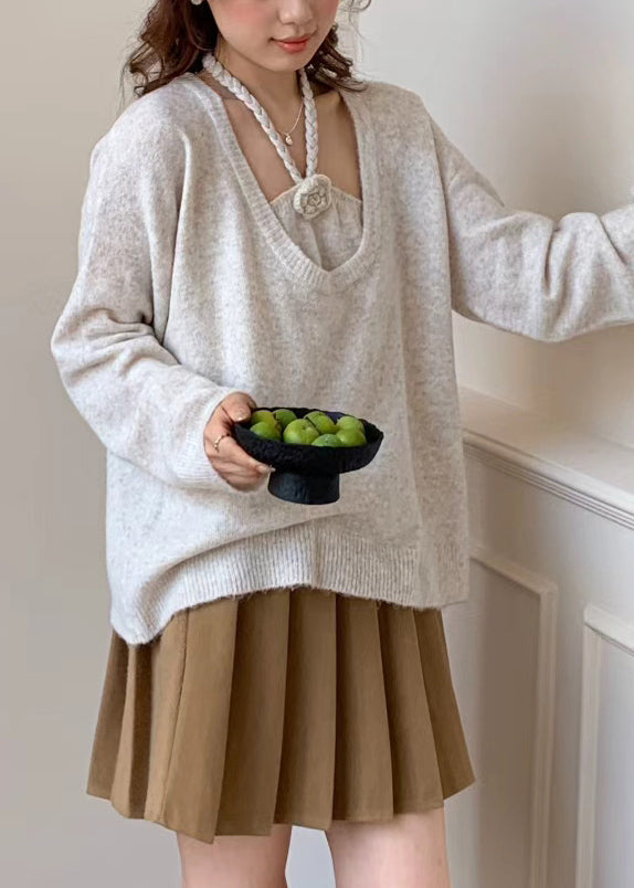 Women Beige Oversized Floral Knitted Tops Two Piece Suit Set Winter