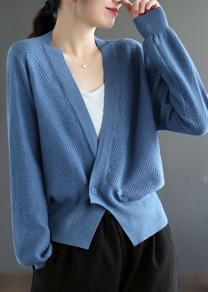 Women Blue V Neck Solid Button Knit Cardigan Fall