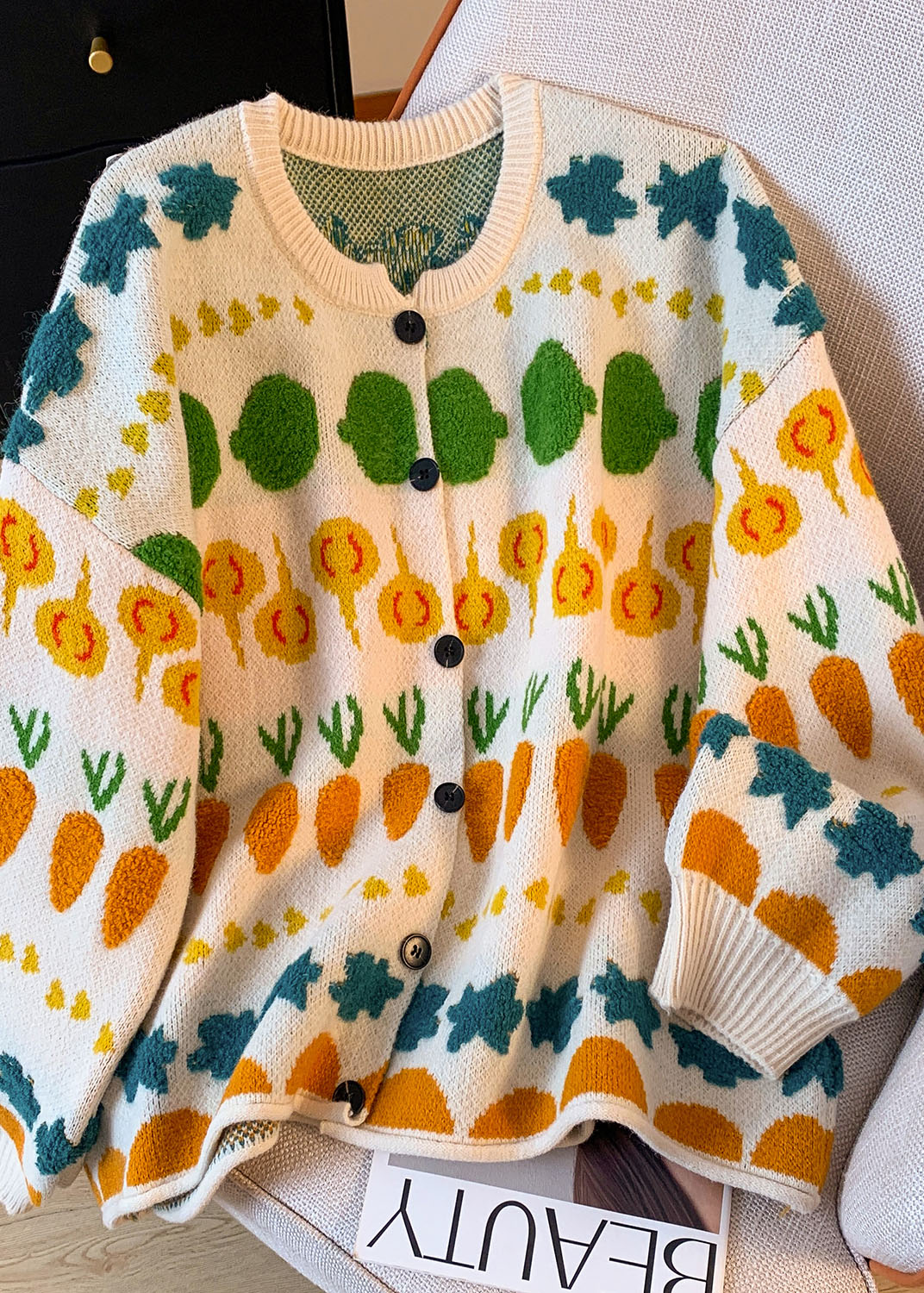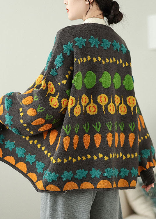 Women Grey O Neck Embroidered Knit Loose Coat Spring