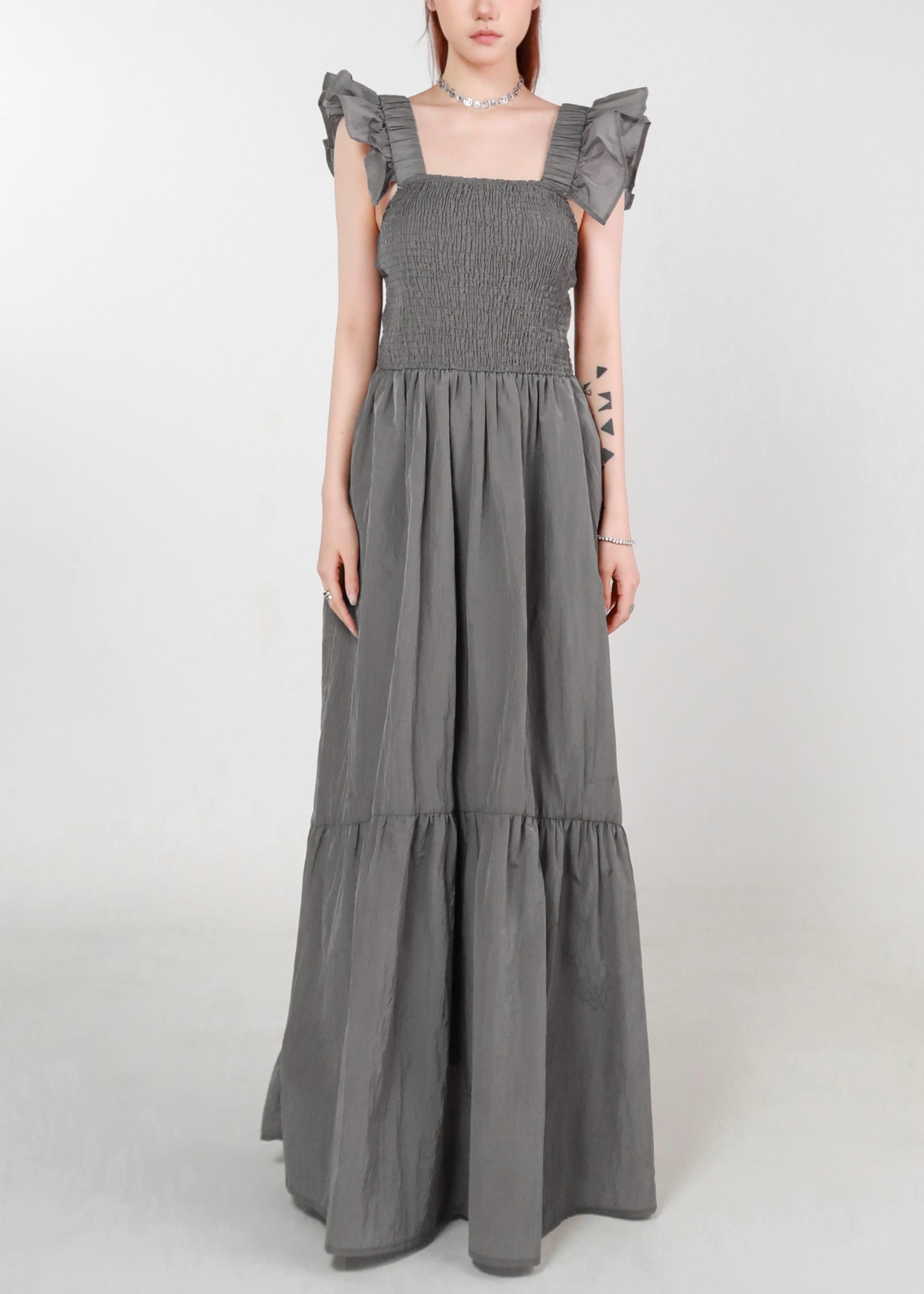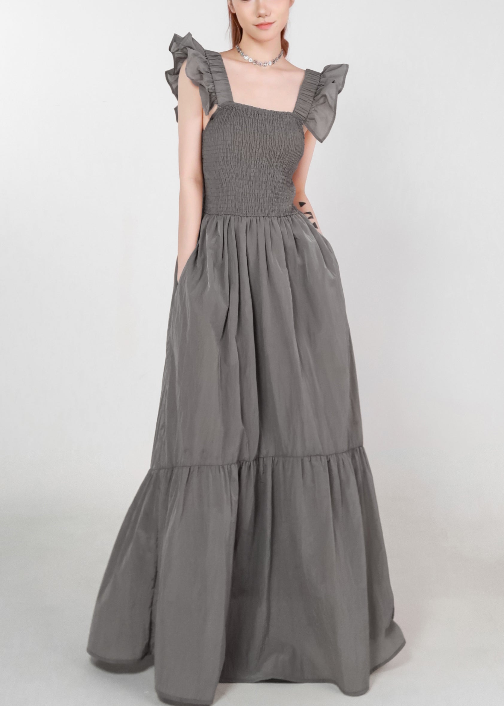 Women Grey Pockets High Waist Cotton Long Dress Summer