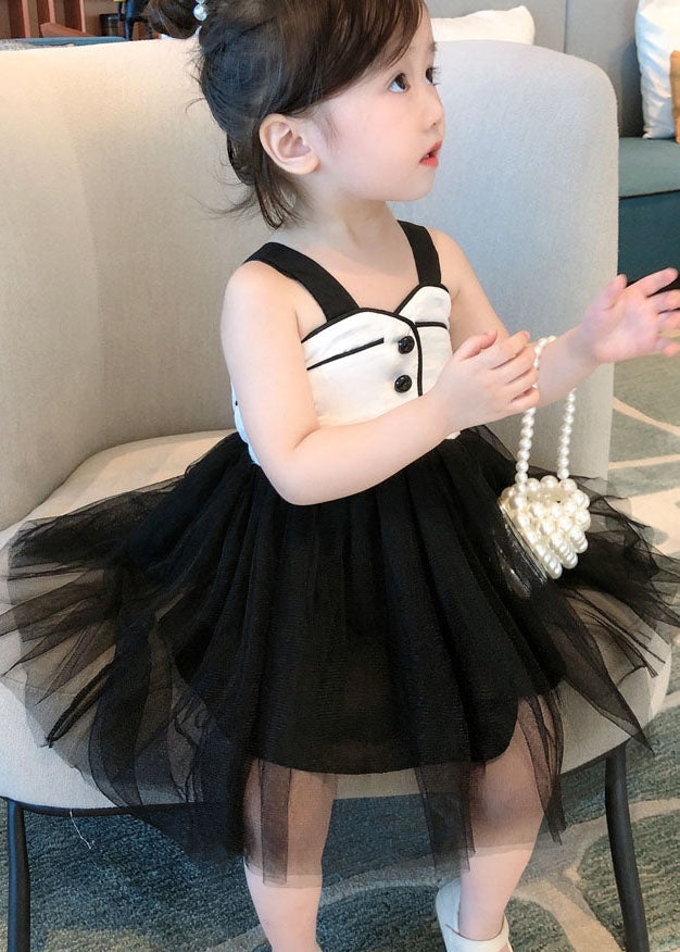Art Black Wrinkled Patchwork Tulle Kids Girls Dress Sleeveless