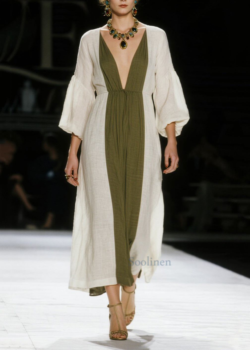 Art White V Neck Patchwork Cotton Ankle Dress Lantern Sleeve