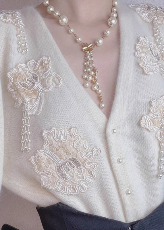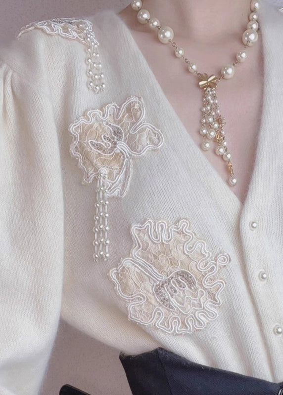 Beautiful Beige Button Nail Bead Patchwork Wool Top Fall