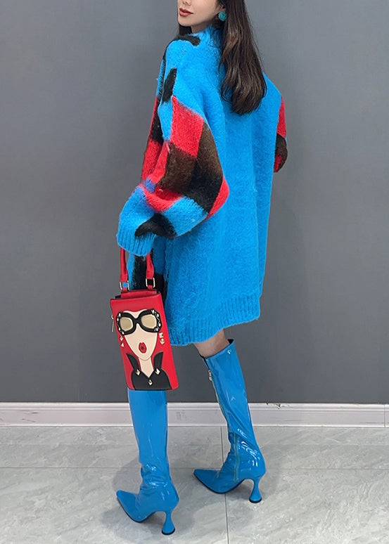 Beautiful Blue Plaid V Neck Button Patchwork Knit Cardigan Fall