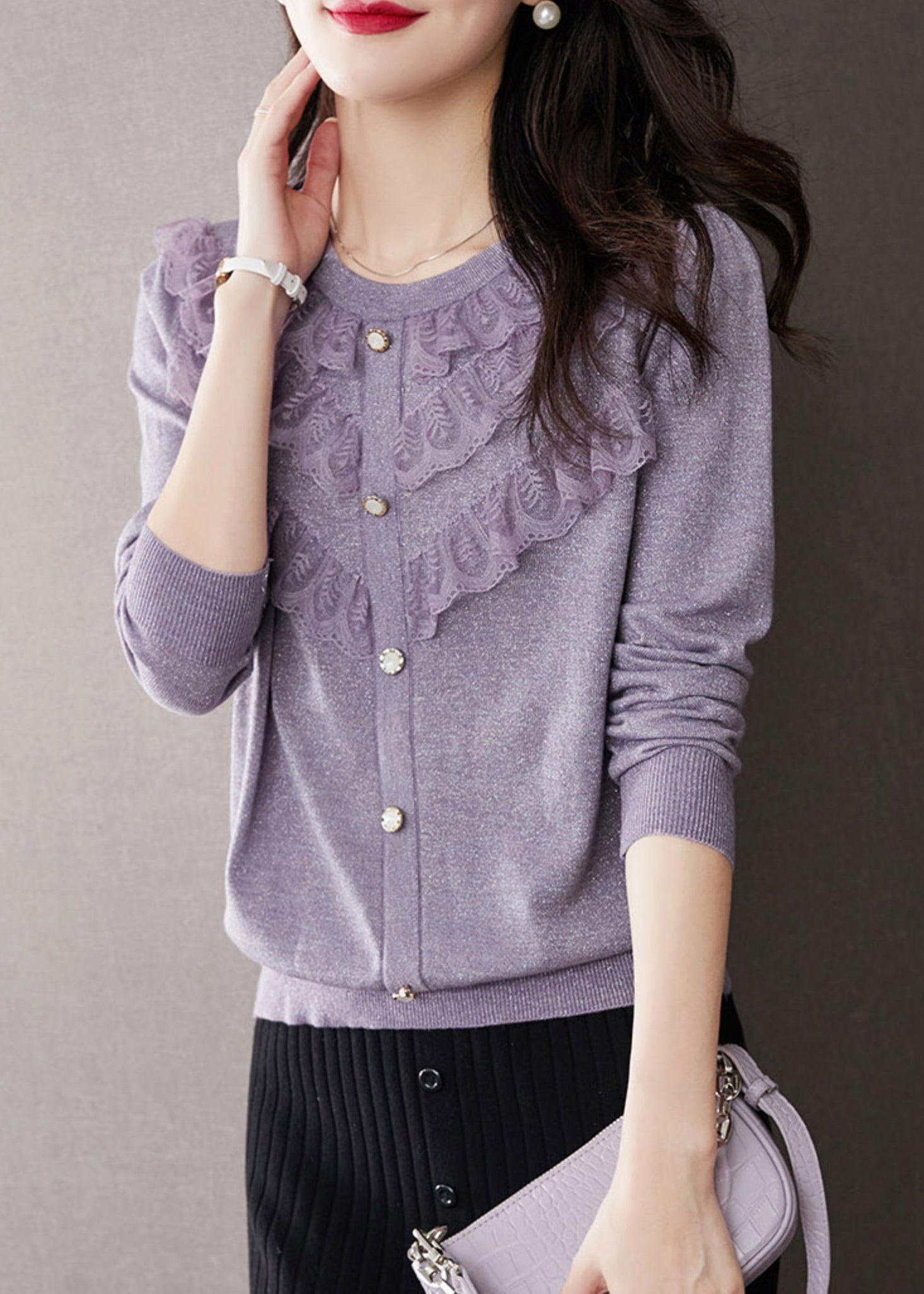 Beautiful Purple O Neck Ruffled Patchwork Knit Tops Fall