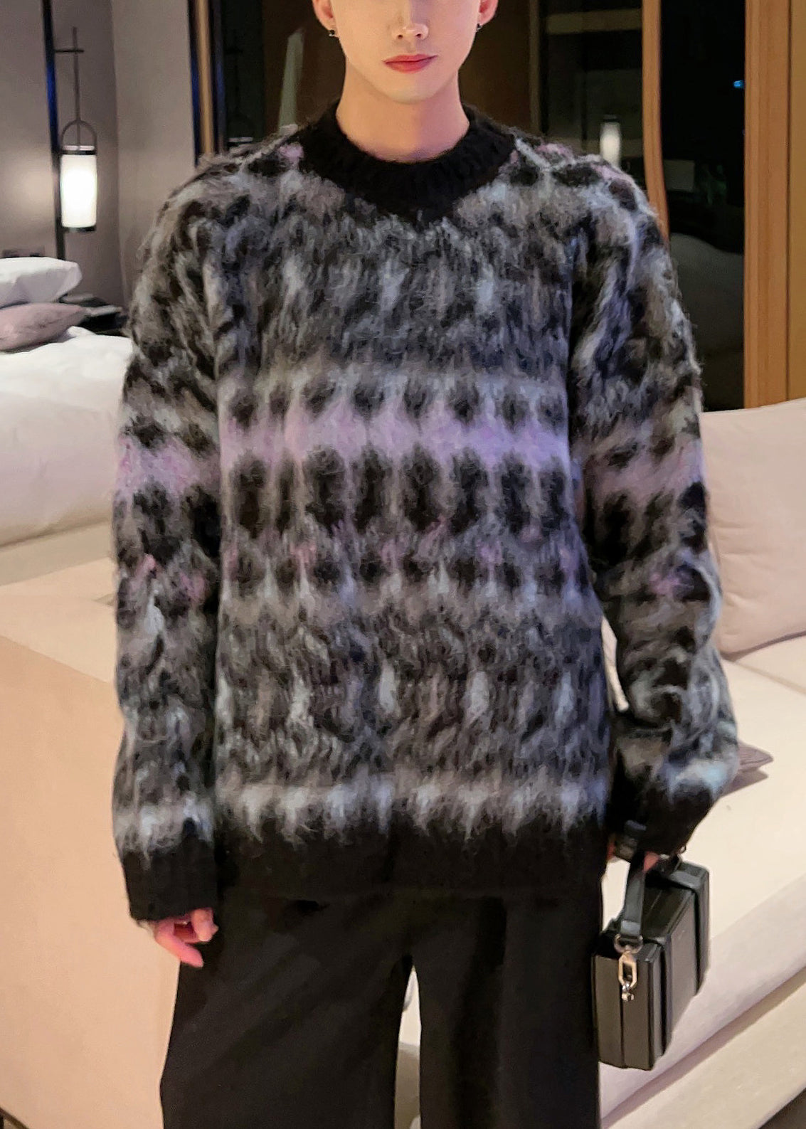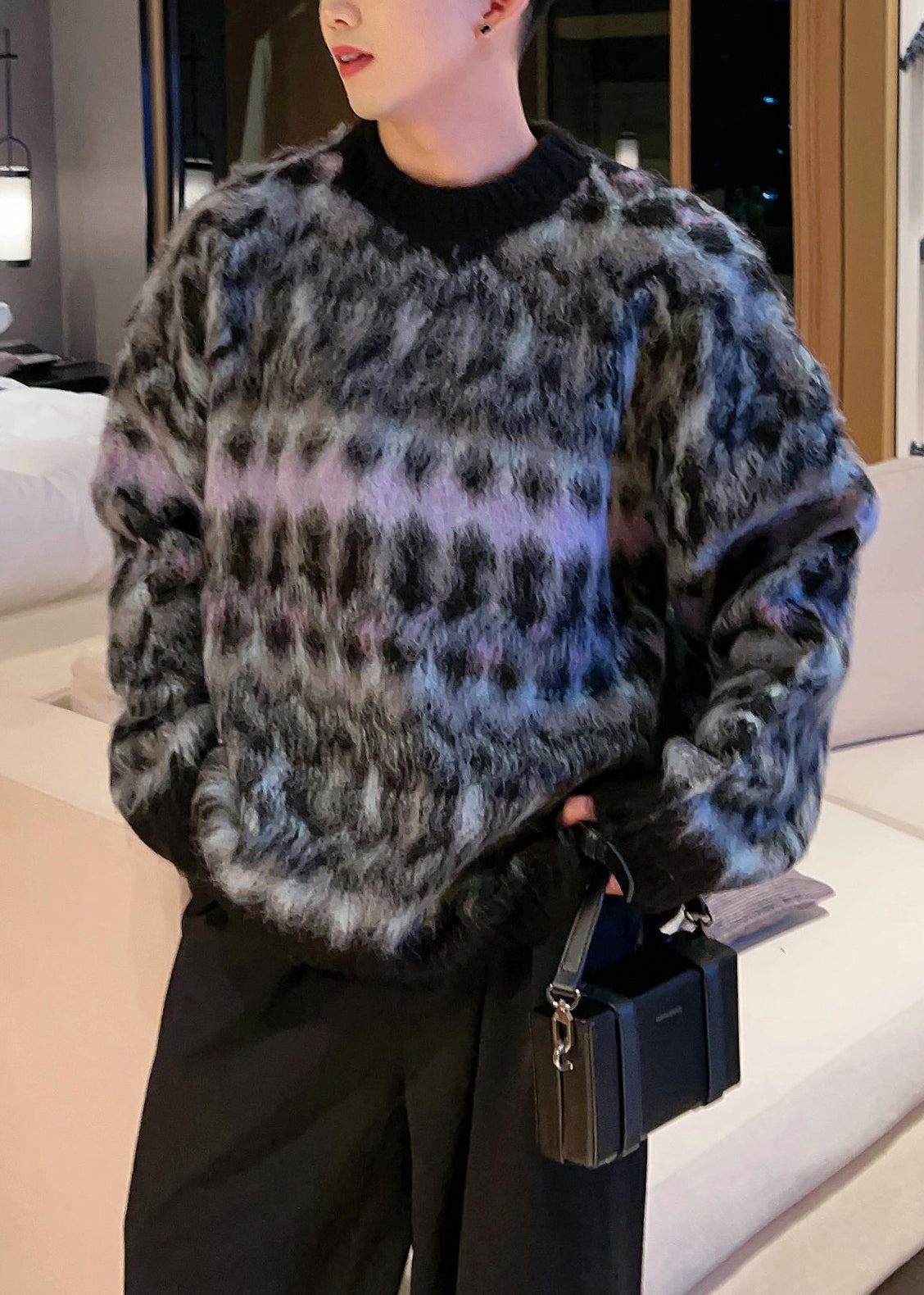 Black Cozy Patchwork Cotton Knit Fall Men Sweaters O Neck