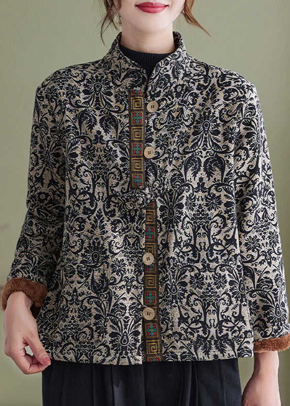 Black Stand Collar Button Cotton Filled Parka Long Sleeve