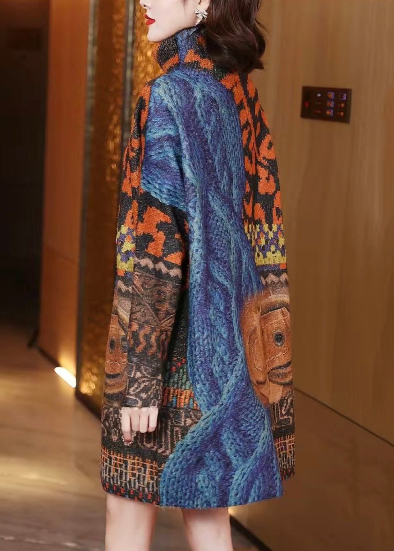 Blue Cozy Patchwork Mink Hair Knitted Mid Dress Turtleneck Long Sleeve