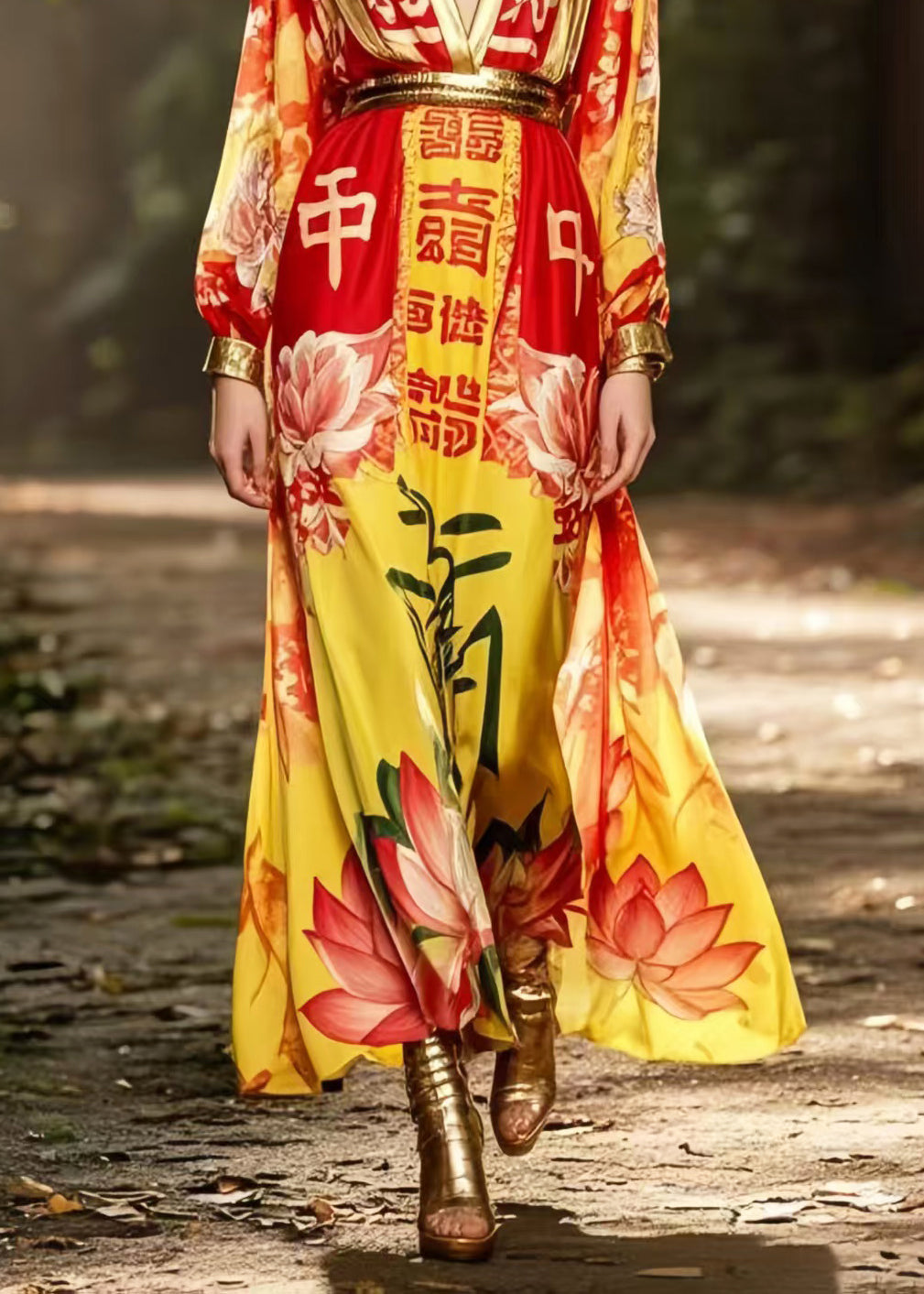 Bohemian Red Cinched Print Chiffon Holiday Dress Spring