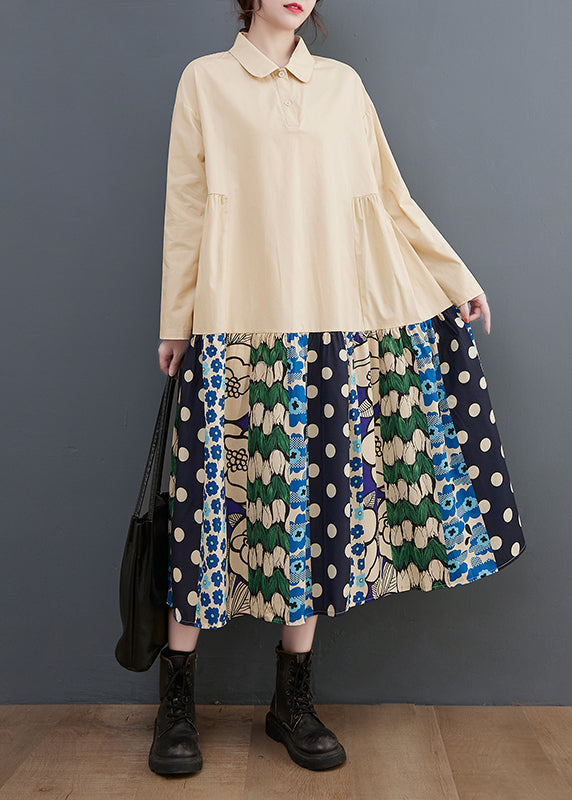 Boho Beige Oversized Patchwork Cotton Long Dress Fall