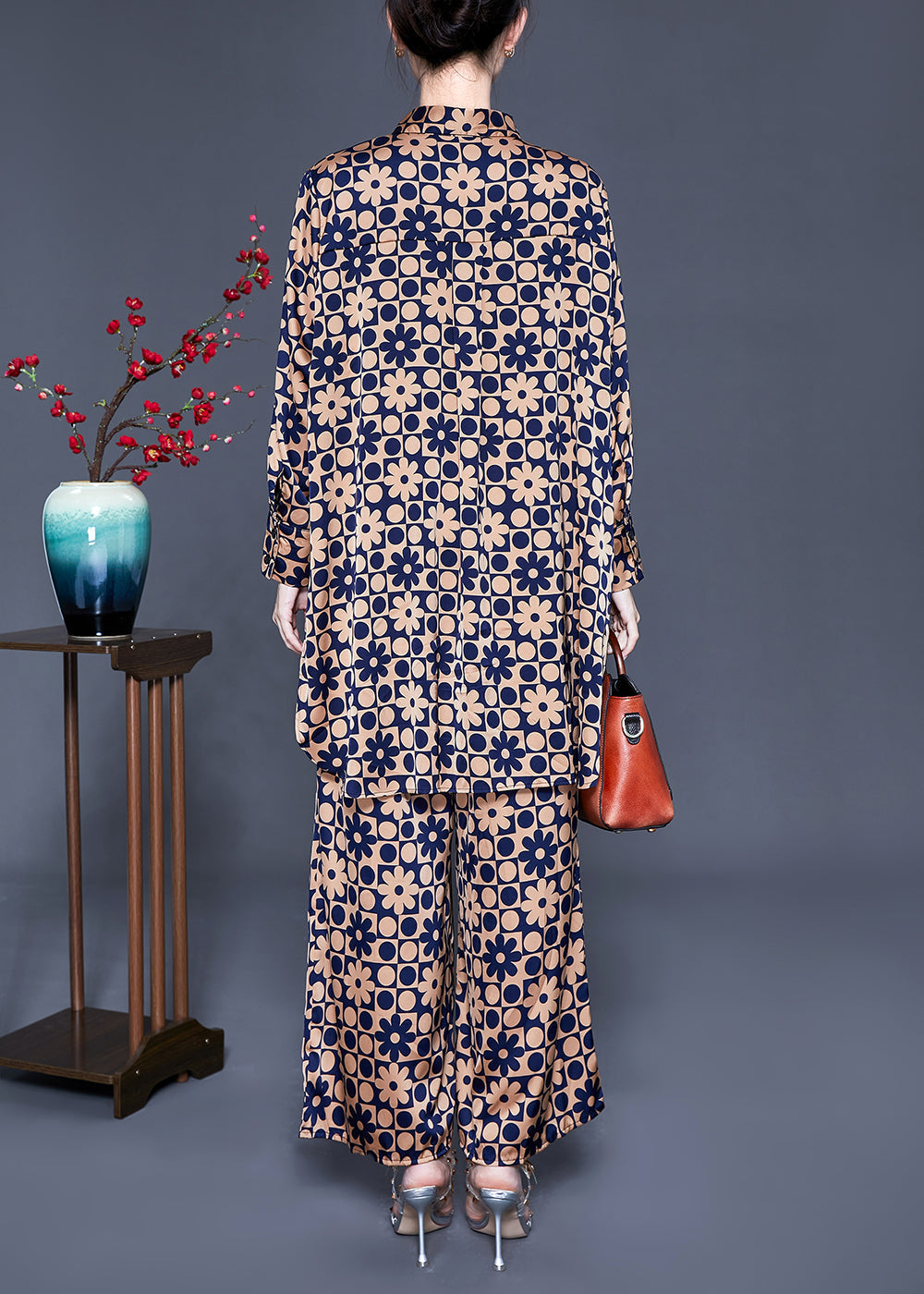 Boho Khaki Stand Collar Print Silk Tops And Pants Two Pieces Set Summer