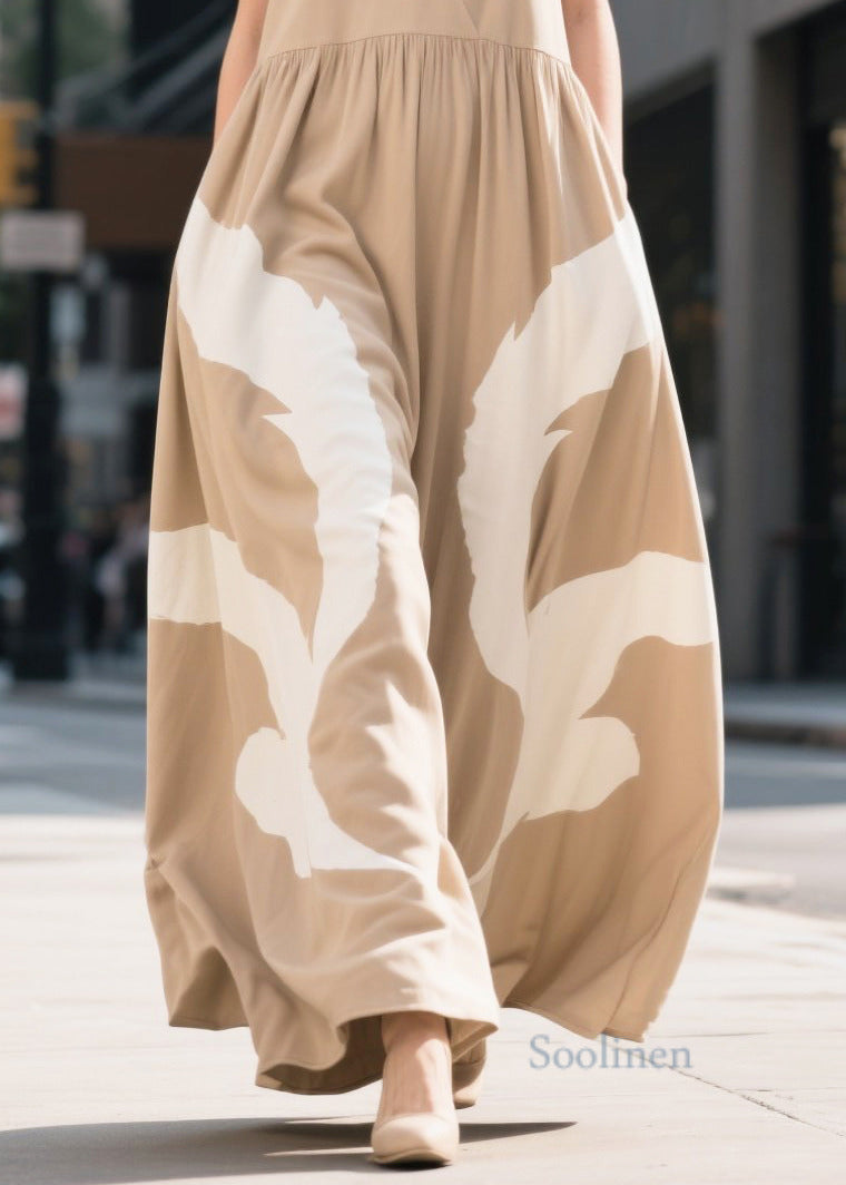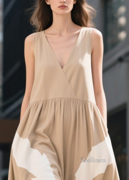 Boho Khaki V Neck Print Cotton Ankle Dress Summer