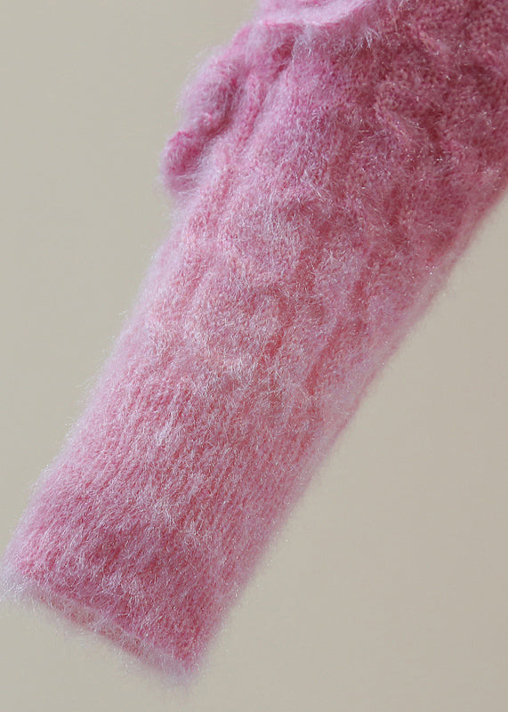 Boho Pink V Neck Floral Zippered Cotton Knit Sweaters Winter